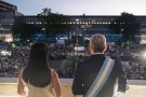 Finalizado el discurso y la jura de los nuevos ministros del gabinete, el gobernador Frigerio se dirigió a la explanada de la Casa de Gobierno, acompañado por su esposa, sus dos hijos, su madre y su padre, y brindó un breve discurso ante la ciudadanía entrerriana que se hizo presente en el acto de asunción de las nuevas autoridades.