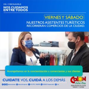 Con la premisa “cuidamos el destino cuidándonos entre todos”, la secretaría de Turismo y Cultura de Colón, como lo había hecho en la etapa anterior, vuelve a implementar la asistencia con informantes, para acompañar a clientes y comerciantes concientizando sobre las buenas prácticas.
