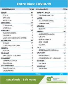 El área de Vigilancia Epidemiológica del Ministerio de Salud, confirmó que en Entre Ríos este lunes se registraron 170 nuevos casos de coronavirus.