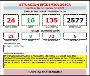 COLÓN – CORONAVIRUS – INFORME DEL HOSPITAL SAN BENJAMÍN REPORTA UN NUEVO FALLECIMIENTO CON COVIDMarcelo Benitez2021-03-16T17:13:29-03:00