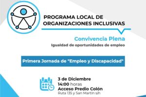 El próximo 3 de diciembre, en el marco del Programa Local de Organizaciones Inclusivas, se llevará a cabo la Primera Jornada de “Empleo y Discapacidad”. Este evento será en el Acceso Predio Colón (Ruta 135 y San Martín s/n) a partir de las 14:00 horas.