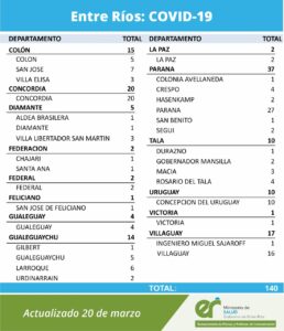 En virtud de los datos reportados al 20 de marzo de 2021 por el área de Vigilancia Epidemiológica del Ministerio de Salud, en Entre Ríos se han sumado 140 casos de Coronavirus.