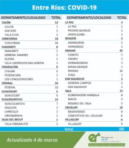El área de Vigilancia Epidemiológica del Ministerio de Salud, confirmó que en Entre Ríos este jueves se registraron 161 nuevos casos de coronavirus.
