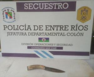 En horas de la tarde, personal de comisaría San José, interviene por un problema Familiar en calle Maipú al 1800, en donde se procede a la aprehensión de un masculino de 24 años de edad, a raíz de que el mismo había lesionado y amenazado a su pareja de 22 años de edad, ambos oriundos de San José, Con conocimiento de la Fiscalía en turno se procede a la detención del joven y traslado hacia las instalaciones de Jefatura Departamental Colon, como asi también al secuestro del elemento que había sido utilizado.