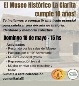 El museo de La Clarita cumple 10 añosMarcelo Benitez2025-05-07T20:53:42-03:00 Project Description La Clarita, miércoles 7 de mayo de 2025 El museo de La Clarita cumple 10 años Nuestro Museo cumple 10 años y es momento de celebrar. DOMINGO 18 DE MAYO. 15:00 hs Museo Histórico “La Clarita”. Te esperamos para disfrutar una hermosa tarde. #museohistorico #celebración #10años #museohistoricolaclarita Mas NoticiasColón (4838) Concepción Del Uruguay (321) Concordia (65) CORONAVIRUS (887) Deportes (568) Destacadas (13897) Economia (136) Liebig (1245) Nacional (460) Parana (603) Policiales (1337) Politica (743) Pronunciamiento (731) Provincial (1766) Regional (627) San José (2834) Sociales (22) Turismo (948) Ubajay (1216) Villa Elisa (2614)