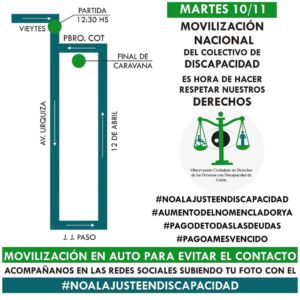 Por esto, le pedimos a la comunidad que nos acompañe el martes 10 de noviembre a las 12:30 horas a movilizarnos en la ciudad de Colón. La misma será en autos para evitar el contacto, respetando los protocolos vigentes. Partiremos desde Urquiza y Vieytes. También pueden acompañarnos desde sus hogares subiendo una foto con el hashtag #NOALAJUSTEENDISCAPACIDAD