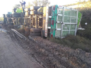TRATÁNDOSE DE UN RODADO VOLKSWAGEN 17220 , ACOPLADO MARCA THANOS, CON  TRANSPORTE AVICOLA. EL CUAL ERA CONDUCIDO POR UN JOVEN CON DOMICILIO EN LA CIUDAD DE COLON. EL CUAL AL TRANSITAR POR MENCIONADO   CAMINO Y LLEGAR A UN SECTOR DONDE SE ENCUENTRA BROSA SUELTA Y POSTERIORMENTE CRUZA UNA ZONA DE HUELLAS PROFUNDAS LO QUE HACE QUE PIERDA EL CONTROL DEL CAMIÓN Y SE PRODUZCA EL VUELCO. EL CONDUCTOR NO SUFRIÓ LESIONES.