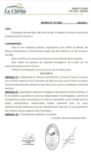 La Comuna de La Clarita mediante Decreto 077/2021 fija el periodo de receso administrativo anual desde el 10 al 21 de enero 2022 inclusive.