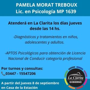 La Clarita: Una profesional en Psicología estará atendiendo en la localidad a partir del 8 de septiembreMarcelo Benitez2022-09-04T18:46:11-03:00 Project Description 03/09/22 Una profesional en Psicología estará atendiendo en la localidad a partir del 8 de septiembre Una profesional en Psicología estará atendiendo en la localidad a partir del 8 de septiembre. Por turnos comunicarse al 03447-15547206 Mas NoticiasColón (4838) Concepción Del Uruguay (321) Concordia (65) CORONAVIRUS (887) Deportes (572) Destacadas (14005) Economia (136) Liebig (1299) Nacional (460) Parana (603) Policiales (1337) Politica (747) Pronunciamiento (731) Provincial (1766) Regional (627) San José (2859) Sociales (22) Turismo (977) Ubajay (1216) Villa Elisa (2643)