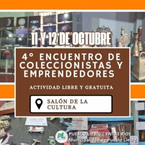 La Municipalidad de Pueblo Liebig invita a toda la comunidad a participar del 4° Encuentro de Coleccionistas y Emprendedores, que se realizará los días 11 y 12 de octubre en el Salón de la Cultura de la Municipalidad de Pueblo Liebig.