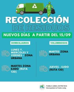 La Municipalidad de Pueblo Liebig informa que, desde el lunes 15 de septiembre, comenzarán a regir nuevos días para la recolección de residuos domiciliarios y voluminosos en nuestra localidad.