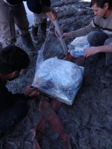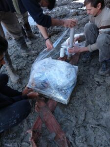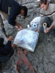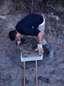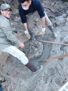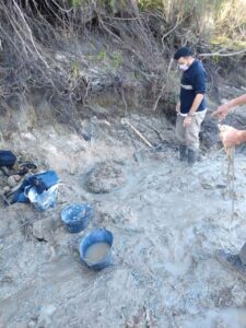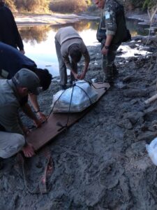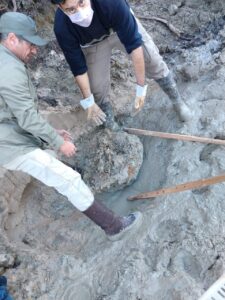 La Dra. Brenda Ferrero y el Lic. Matías Peralta investigadores del Laboratorio de Paleontología de Vertebrados perteneciente al Centro de Investigación Científica y de Transferencia de Tecnología a la Producción- CICYTTP-CONICET (Diamante) participaron del rescate de un ejemplar fósil hallado en el Arroyo Perucho Verna en cercanía de la Reserva Natural Los Teros.