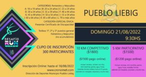 Desde la Dirección de Deportes de la Municipalidad de Pueblo Liebig, invitamos a participar de la Maratón en nuestro pueblo.