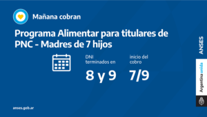 En el marco del Plan Argentina contra el Hambre del Ministerio de Desarrollo Social, la ANSES acompaña con el pago del programa Alimentar. Cobran Madres de 7 hijos que perciben PNC con documentos finalizados en 8 y 9, no poseen la tarjeta plástica y reciben el dinero en la misma cuenta de la prestación.