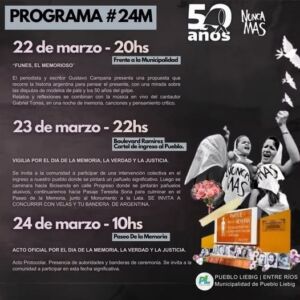 A 50 años del golpe de Estado de 1976, la Municipalidad de Pueblo Liebig invita a la comunidad a participar de una serie de propuestas para reflexionar, recordar y reafirmar el compromiso con la Memoria, la Verdad y la Justicia.