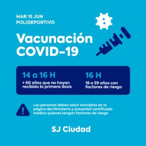 Se estará vacunando este martes de 14h a 16h aplicando dosis a mayores de 60 años que aún no hayan recibido primera dosis y desde las 16h en adelante a personas de 18 a 59 años con factores de riesgo.
