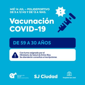En esta oportunidad, este miércoles 14 de julio a partir de las 9 de la mañana en el Polideportivo Municipal, se vacunará a aquellas personas entre los 30 a 59 de edad, sin factores de riesgo, que se encuentran registradas en la página del Ministerio de Salud. En tanto, los mensajes con el horario asignado, estarán llegando al celular que dejaron registrado en la página al momento de inscribirse.