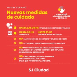 Conocido el nuevo decreto del gobierno provincial con restricciones sanitarias destinadas a contener la transmisión del Covid-19 , desde la Municipalidad de San José informamos, a través del Decreto 103/2021, los artículos que tendrán vigencia hasta el 21 de mayo inclusive, en el marco de la preocupante y crítica segunda ola de contagios que transitamos