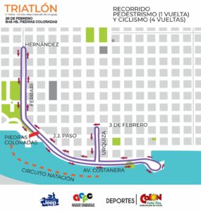 El recorrido será en pedestrismo (1 vuelta) y ciclismo (4 vueltas). La distancia es Sprint (750/20/5). La largada será en el Club Piedras Coloradas a las 8:45 hs. Desde la Dirección de Deportes de Colón se detalla un mapa con el circuito para cada uno de los competidores.