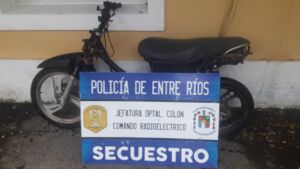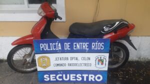 En horas de la madrugada de la fecha, personal de esta Jefatura, se encontraba realizando recorridas de prevención en inmediaciones del barrio Plan Libertad, en donde visualizan dos masculinos que se conducían en una motocicleta, lo cual al ver la presencia policial los mismos abandonaron el rodado en calles Rufino Mir y Moreno, siendo ésta coincidente con la denunciada como sustraída en este mes. Se procede al formal secuestro de este motovehículo marca Gilera modelo Smash 110cc, con conocimiento de la unidad fiscal de Colón y posterior entrega a su propietaria.