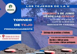 La ๐๐ฎ๐ง๐ข๐๐ข๐ฉ๐๐ฅ๐ข๐๐๐ ๐๐ ๐๐ซ๐จ๐ง๐ฎ๐ง๐๐ข๐๐ฆ๐ข๐๐ง๐ญ๐จ los invita a participar de una nueva ediciรณn del Torneo de Tejo ยซ๐๐ค๐จ ๐๐๐๐๐ง๐ค๐จ ๐๐ ๐ก๐ ๐ยป, que se desarrollarรก el prรณximo domingo 4 de junio en el predio de la ยซUยป, frente a la estaciรณn del ferrocarril. El evento, que tendrรก servicio de cantina, comenzarรก ๐ ๐ฅ๐๐ฌ ๐ ๐๐ ๐ฅ๐ ๐ฆ๐๐งฬ๐๐ง๐, y las inscripciones se abrirรกn una hora antes durante el mismo dรญa.