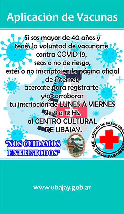 Marcelo Benitez2021-06-27T20:09:58-03:00UBAJAY 27/06/21 APLICACIÓN DE VACUNAS PARA COVID. Si sos mayor de 40 años y tenés la voluntad de vacunarte contra covid 19, seas [...]
