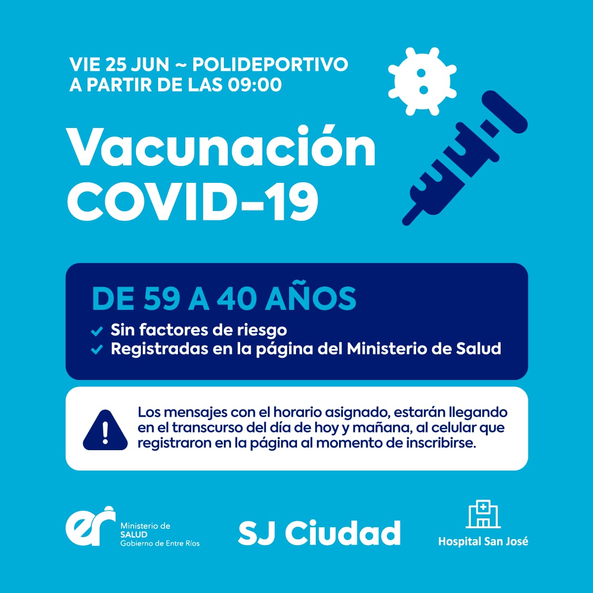 SAN JOSÉ MAÑANA VIERNES Nueva jornada de vacunación para personas entre los 59 a 40 años de edad