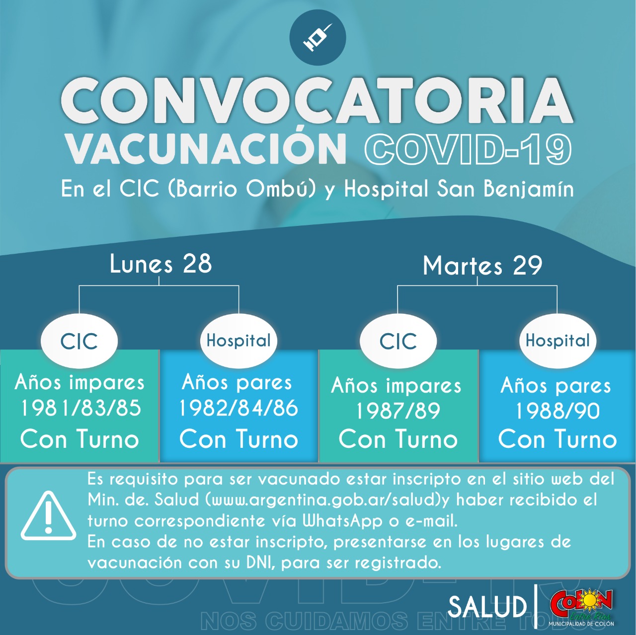 Marcelo Benitez2021-06-27T19:00:44-03:00COLÓN 27/06/21 Vacunación COVID19 en el CIC (Barrio Ombú) y Hospital San Benjamín Se convoca a las personas a las que les haya [...]
