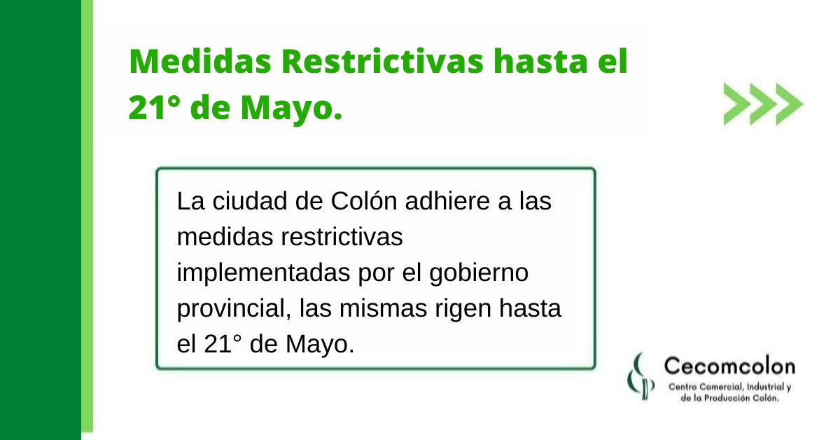 Marcelo Benitez2021-05-03T19:03:47-03:00COLÓN 03/05/21 Medidas restrictivas hasta el 21 de Mayo La ciudad de Colón adhiere a las medidas restrictivas reglamentadas por el gobierno provincial, [...]