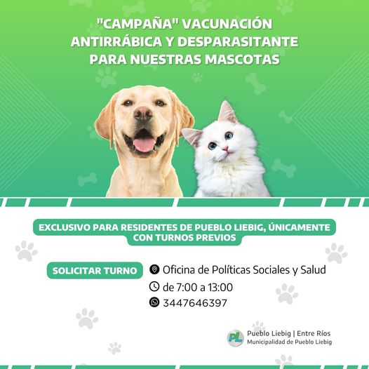 Marcelo Benitez2024-05-01T19:12:47-03:00Jueves 25 de abril de 2024 "CAMPAÑA" VACUNACIÓN ANTIRRÁBICA Y DESPARASITANTE PARA NUESTRAS MASCOTAS Exclusivo para residentes de Pueblo Liebig, Únicamente con turnos [...]