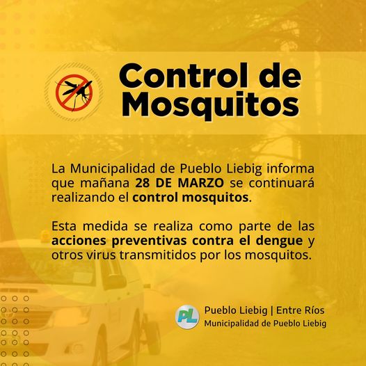 Marcelo Benitez2024-04-03T23:25:52-03:00Miércoles 27 de marzo de 2024 CONTROL SEMANAL DE MOSQUITOS La Municipalidad de Pueblo Liebig informa que mañana se continuará realizando el control [...]