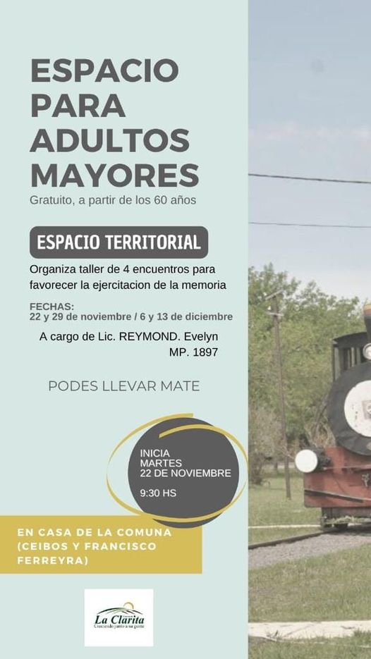 Marcelo Benitez2022-11-16T23:54:46-03:0016/11/22 LA CLARITA: ESPACIO PARA ADULTOS MAYORES El martes 22 de noviembre a las 09:30 horas iniciará un Espacio gratuito para adultos mayores [...]