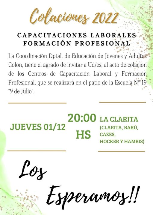 Marcelo Benitez2022-11-29T23:44:13-03:0028/11/22 REPROGRAMADO PARA EL LUNES 12 DE DICIEMBRE NUEVAMENTE ESTE AÑO SOMOS SEDE DEL ACTO DE COLACION DE LOS CENTROS DE CAPACITACION DE [...]
