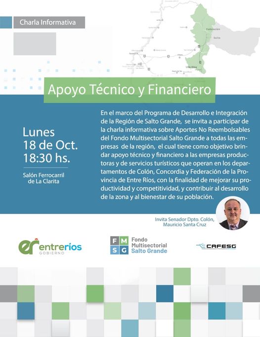 Marcelo Benitez2021-10-14T23:55:00-03:0014/10/21 charla informativa sobre aportes no reintegrables que otorga el Fondo Multisectorial Salto Grande Invitamos a empresas, productores agrícolas, apicolas, ganaderos, avicolas, etc. [...]