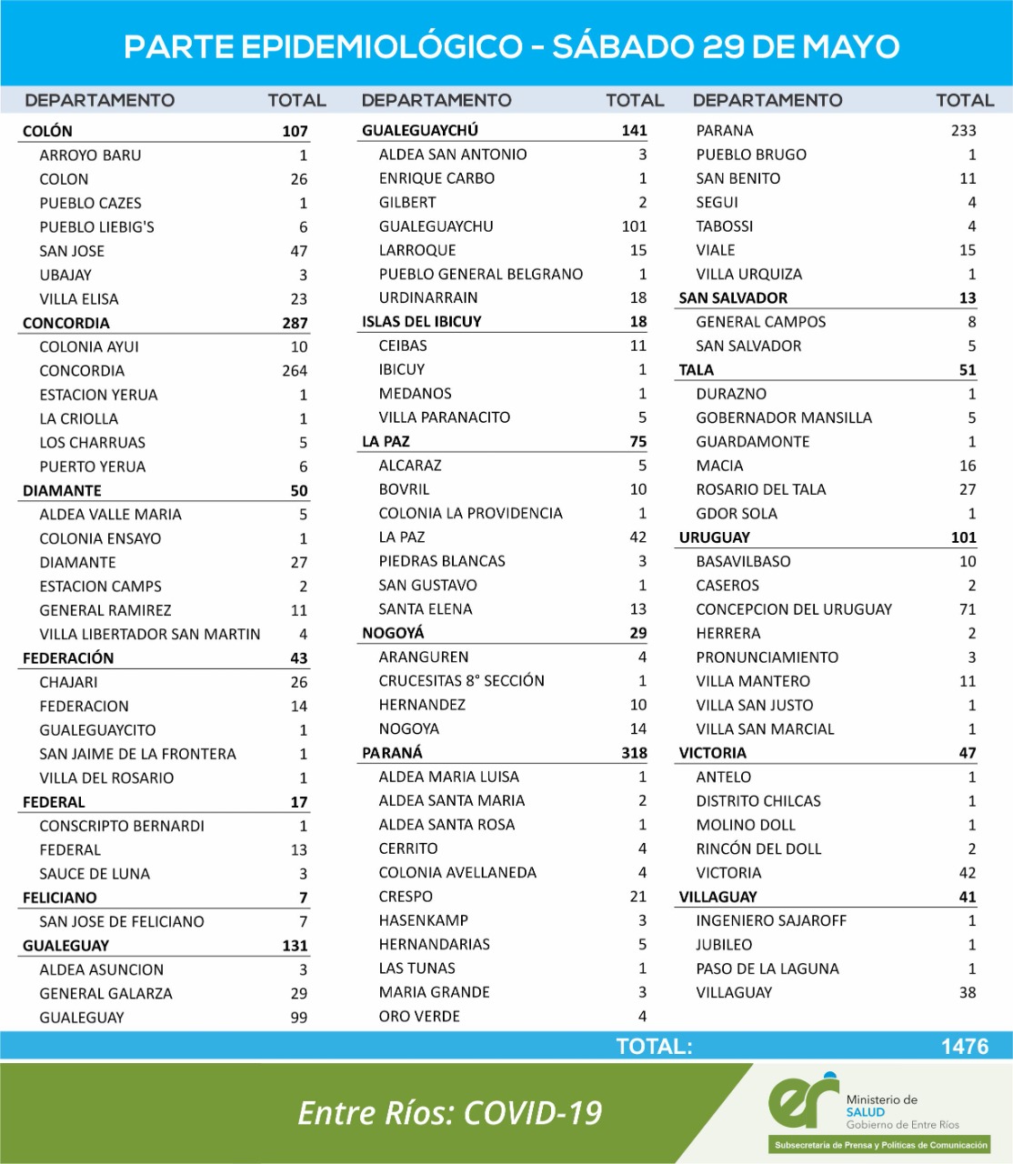CORONAVIRUS – NUEVAMENTE EL Dpto. COLÓN POR ENCIMA DE LOS 100 CASOS Y LA Pcia. POR ENCIMA DE LOS 1.000 CASOS